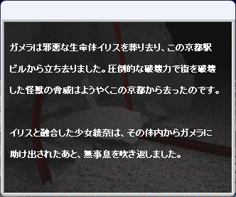 この「京都駅ビル」マップでは、同時に公開されている映画「ガメラ3邪神<イリス>覚醒」のストーリーと連動したゲーム展開が行われることになります。京都を舞台に決戦の火蓋を切るガメラとイリス。京都駅ビルのオーナーとして、あなたは予想できる大災害に向けて準備を怠るわけには行きません。創造と破壊。この全く相反する出来事を軸にして、あなたはオーナーとしての仕事を果たさなくてはならないのです。