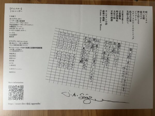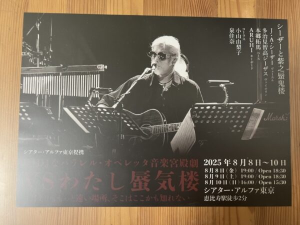 “DJDJなパラレル・オペレッタ音楽宮殿劇”と銘打たれた「VSわたし蜃気楼」。本公演には演劇実験室◉万有引力の劇団員をはじめとした俳優陣が舞踏や朗読で参加するほか、J・A・シーザーとともに数々の舞台やコンサートを重ねてきた多治見智高ジーザス(Violin)、本郷拓馬(B)、ARUHI(Key)、小山由梨子(Cho)、泉佳奈(Cho)によるバンド・シーザーと紫之蜃鬼楼が、J・A・シーザーの未発表曲や、寺山修司の長歌をもとにした新曲を生演奏する。