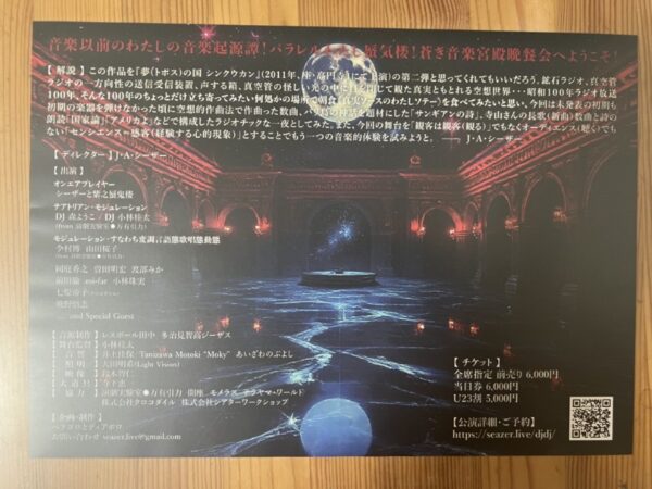 この作品を「シンクウカン」の第二弾と思ってくれてもいいだろう。鉱石ラジオ、真空管ラジオの一方向性の送信受信装置、 声する箱、真空管の怪しい光の中に目を閉じて観た真実ともとれる空想世界・・・わたしは今回の舞台を「観客は観客(観る)」でもなく オーディエンス(聴く)でもない「センシエンス=感客(経験する心的現象)」とした・・・昭和100年、ラジオ放送100年、そんな100年の ちょっとだけ立ち寄ってみたい何処かの場所で朝食《真実ソースのわたしソテー》を食べてみたいと思った。 最近よく思う、これで最後のコンサートになるかもしれないと。だからじゃないが、瞬間瞬間の出会いを大切にしたいものだと。 今回は未発表の初期も初期の楽器を弾けなかった時に空想的作曲法で作曲った数曲。俳優楽器のための「母体の牧歌」やバリ島の神話を 題材にした「サンギアンの詩」、寺山さんの長歌(新曲)数曲と詩の朗読「国家論」「アメリカよ」などで構成したラジオチックな一夜としてみた。 楽しんでいただきたい。 —— J・A・シーザー